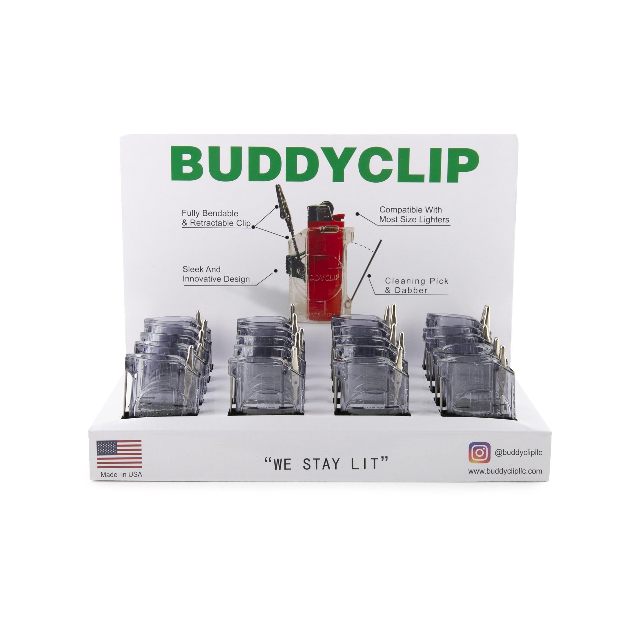 The BuddyClip features a fully bendable and retractable roach clip, pick, cleaner and dabber all in a sleek innovative design that is compatible with most disposable lighters. Save your pockets while saving your fingers. BuddyClip is made and manufactured with pride right here in the U.S.A.