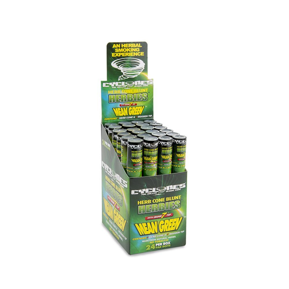 The Cyclone Herbies Mean Green pre-rolled cones are made with all natural herbs and contain no tobacco. Each cone has a reusable wooden Dank 7 tip and comes in its own reusable and protective tube. Each display contains 24 cones.