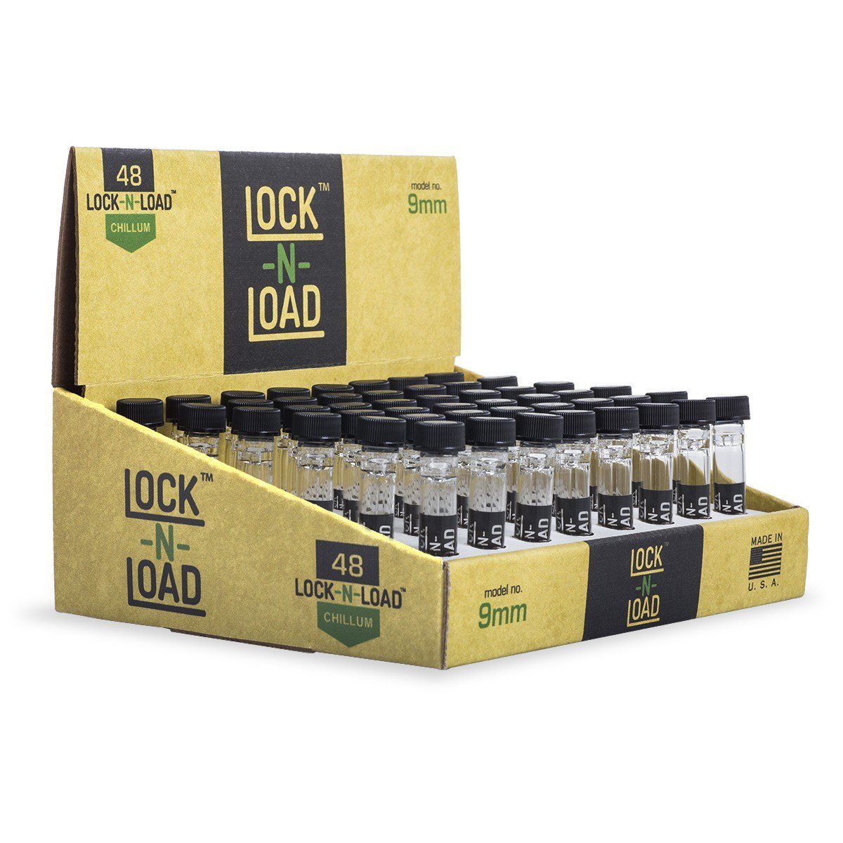 The Lock-N-Load Chillum is a new and innovative one-hitter specifically designed for cannabis consumers on the go. Featuring a compact size, the 9mm pharmaceutical grade glass chillum come with a twist cap for safe storage and easy opening while keeping it smell proof. Available in a countertop display case with 48 count glass lock-n-load chillum.